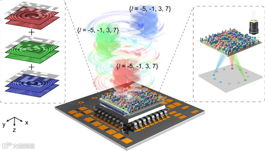 快速增加的数据传输负载需要现有光电系统实现革命性的突破。近年来,以螺旋波前表示的轨道角动量(OAM)由于其理论上无界的螺旋模式指数,已成为提高信息容量的一种新的光自由度。正交的OAM模式状态可用作信息载体,创造出高安全加密全息术、光可寻址三维(3D)显示、大容量光通信、六维数据存储和高维量子纠缠等概念。物理上,检测单个OAM模式状态的机制可分为衍射、干涉、表面等离子体极化子和轨道光电效应。值得注意的是,在实际的OAM复用应用中,各种高效的模式转换衍射光学元件(DOE)已被提出用于检测OAM模式状态。其中,具有坐标变换相位分布的超表面双透镜已被集成到互补金属氧化物半导体(CMOS)相机上,大大提高了OAM分选器的紧凑性。然而,由于衍射中的色散,我们在这方面尚未能够实现不同波长叠加OAM模式状态的同时检测。为了校正色差,传统方法需要多个具有相反色散特性的透镜,从而导致光学系统庞大。近年来,由亚波长超原子组成的超表面为操纵光的各种物理特性以实现超越传统体光学的多种功能提供了前所未有的平台。