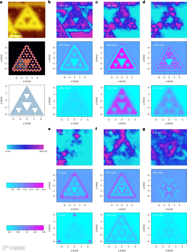 近日,荷兰乌得勒支大学C. Morais Smith课题组与上海交通大学贾金锋教授团队合作证明在锑化铟衬底上沉积薄层铋后形成的分形中出现了拓扑边界态和角态。其中扫描隧道显微镜结果和理论计算表明在Sierpiński三角形角上会出现近零能量模式并具有稳定性,在更高能量下会形成外边界和内边界模式。这项工作为扩展具有稳健和受保护拓扑态的非整数维真实材料中的电子设备应用开辟了前景。上述研究成果发表于期刊《Nature Physics》。(张甜)