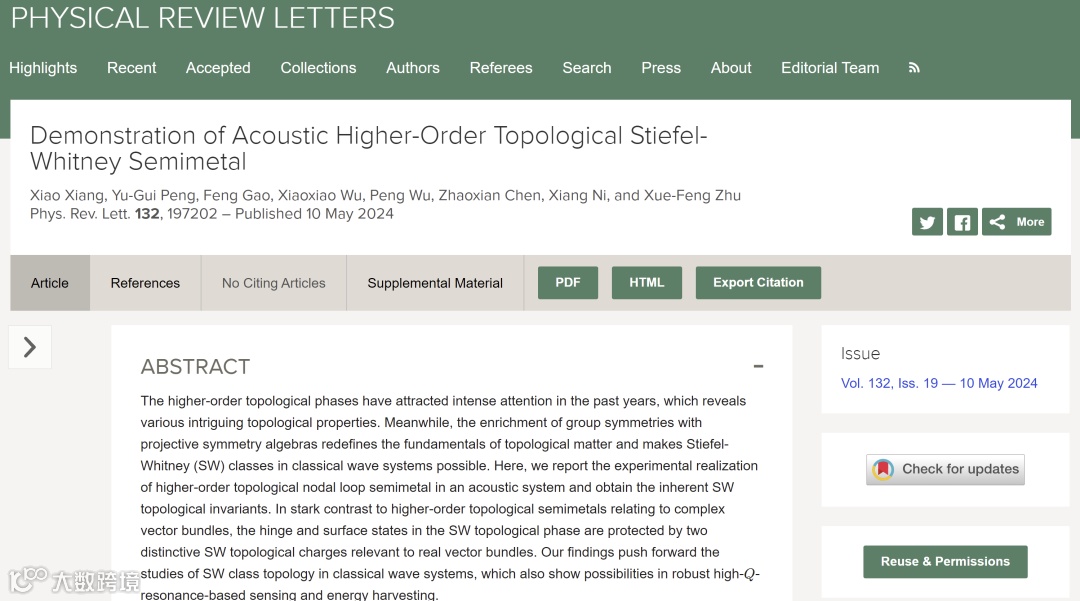 近日,祝雪丰教授团队在Stiefel-Whitney类的声学高阶拓扑半金属实验观测方面取得进展,相关工作以“Demonstration of acoustic higher-order topological Stiefel-Whitney semimetal”为题,于2024年5月10日发表在物理评论快报《Physical Review Letter》上,该工作的理论方面得到了中南大学倪祥教授的详细指导,武汉大学余睿教授和华中科技大学郇真教授也提供很多宝贵的建议。华中科技大学物理学院博士生向霄为论文的第一作者,祝雪丰教授、彭玉桂副教授以及中南大学的倪祥教授为论文的共同通讯作者。物理学院博士生高峰、科研助理武朋,香港科技大学(广州)吴肖肖助理教授及南京大学陈召宪博士后对该工作也有重要贡献。华中科技大学为该工作的第一完成单位。