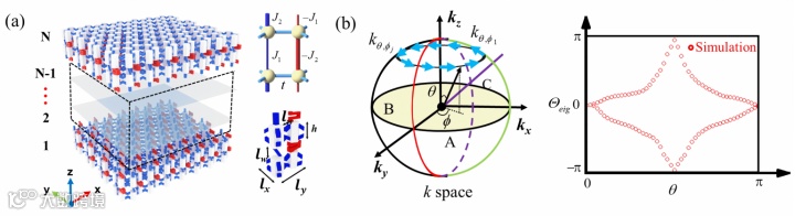 图1展示了HOTSWS的声学模型。声学结构由六边形声学谐振器和耦合管组成的声子晶体,其中蓝色和红色耦合管分别表示正耦合和负耦合。我们通过Wilson loop的方法去计算二阶SW不变量:在第一BZ的k点处定义一个球体,其包裹着一个节点环。蓝色箭头(N波矢量)在k空间中以固定的方位角标记圆环,右图的Wilson loop谱表明w2 = 1。