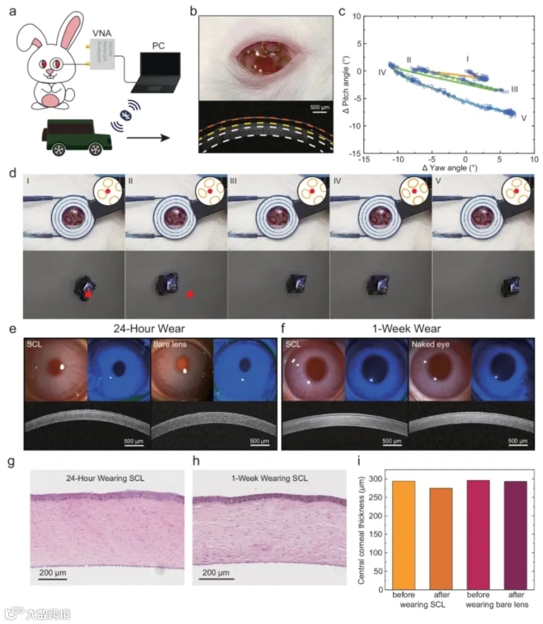 兔子眼睛和人眼角膜的曲率很接近,他们以兔子做试验,为一只兔子戴上了隐形眼镜,又在它眼前放了一个机器车。当兔子眼睛转动时,隐形眼镜捕捉到信号,通过蓝牙模块,将信号传递到小车上,小车也跟着兔子的眼睛前后左右移动。朱衡天介绍,团队用了两种模式,检测隐形眼镜是否安全无害,“一种是让兔子连续24小时佩戴眼镜,另一种模式是模拟人类佩戴隐形眼镜的习惯,每天佩戴8小时,连续佩戴7天,结果显示,兔子的眼角膜没有物理损伤,与市场上的隐形眼镜无明显差异。”