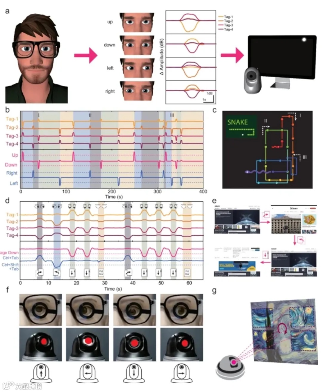 “我们在隐形眼镜中植入了四个射频器件,封装在在隐形眼镜的四周。当外部负责通讯的无线射频装置向隐形眼镜发出射频信号时,如果眼球移动了,反射回无线射频装置的射频信号的频率和强度就会发生变化。通过分析信号的数据,我们就能知道眼动的轨迹。”论文通讯作者、南京大学徐飞教授介绍。