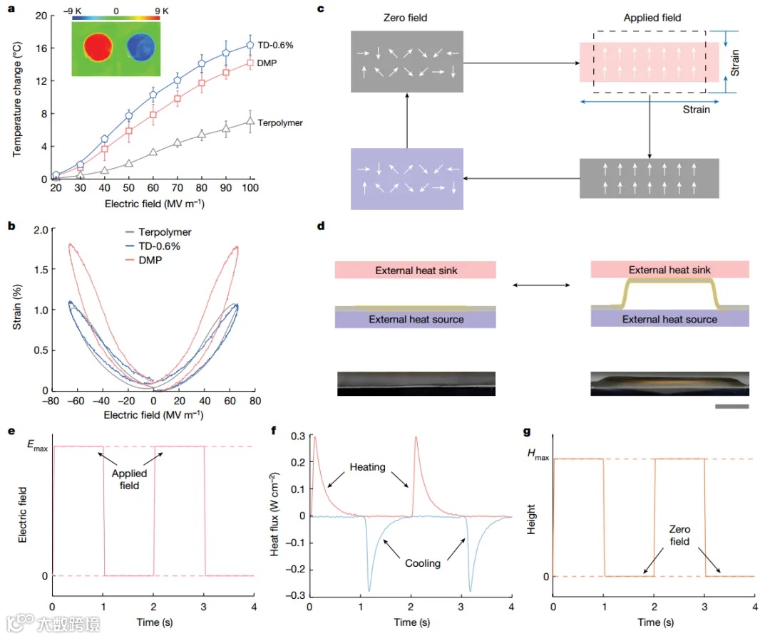 另外,2023年11月30日,上海交通大学钱小石团队在Science 在线发表题为“Colossal electrocaloric effect in an interface-augmented ferroelectric polymer”的研究论文,该研究报道了一种利用界面增强铁电聚合物中的巨大电热效应的策略。该研究以有机晶体二甲己二醇(DMHD)作为三维牺牲载体,在聚偏氟乙烯基三元共聚物的非均相界面上组装极性构象。蒸发DMHD后,类外延过程产生了一个分布超细、多构象共存的极性界面,具有巨大的构象熵。在低电场条件下,界面增强三元共聚物的熵变达到100 J/(kg·K)。这种界面极化策略一般适用于介质电容器、超级电容器等相关应用(点击阅读)。