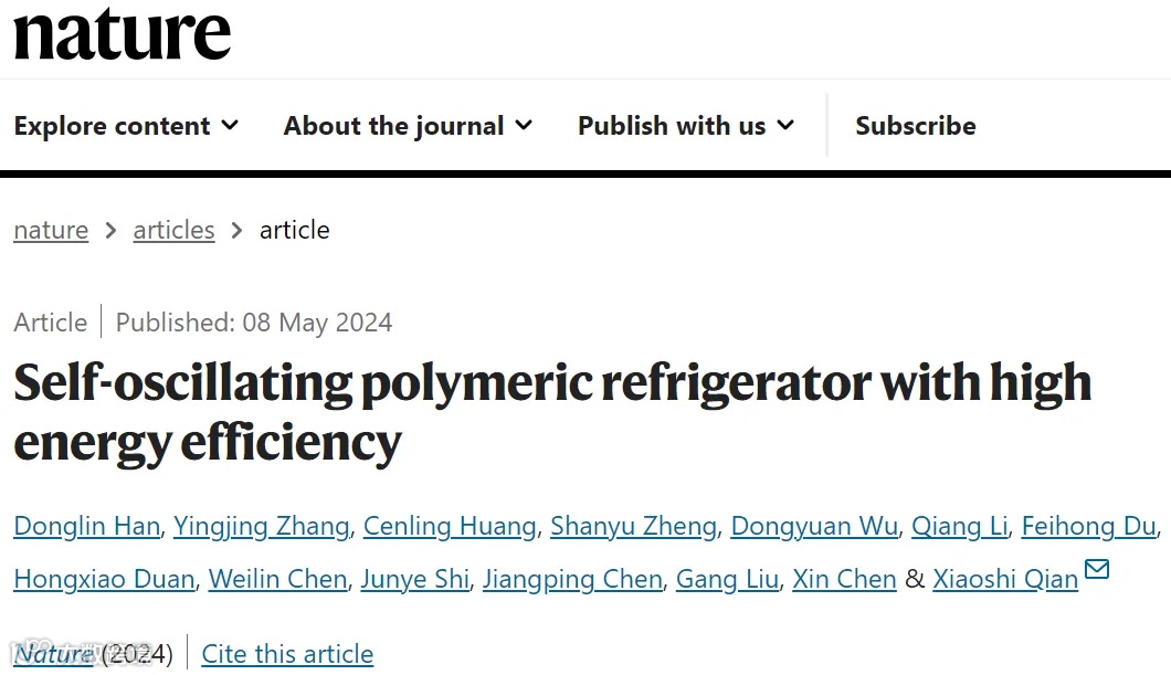 2024年5月8日,上海交通大学钱小石团队在Nature 在线发表题为“Self-oscillating polymeric refrigerator with high energy efficiency”的研究论文,该研究报告了一种利用聚合铁电体提供的电热机械协同作用的电热薄膜装置。在一次交流电刺激下,该装置由工作体自身进行热循环和机械循环,形成无外部驱动、自循环的软冰箱。