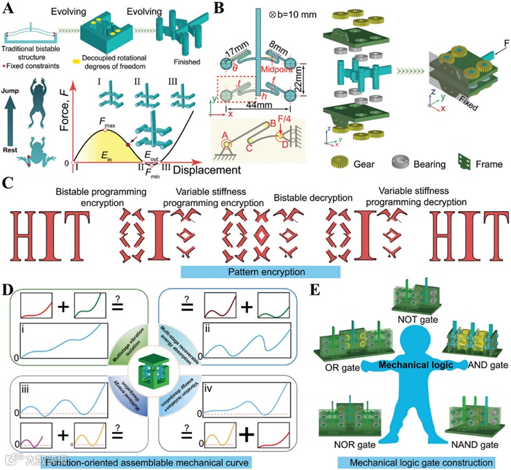 近日,哈尔滨工业大学刘立武、刘彦菊教授团队受青蛙后腿跳跃的启发,通过精心的结构设计,开发了以功能/应用为导向的双稳态单元图案(UMs),并提出了相应的组装策略。从它们的逐步演化中衍生出三种功能应用。首先是构建按需组装的力学曲线,包括多级隔振、可回收能量吸收和能量耗散,以及综合隔振和能量耗散特性。其次,利用双稳态和形状记忆可编程性开发了机械和温度双模式加密策略,从而为n位加密设备提供了4n种加密和解密模式。最后,建立了五个非易失性基本机械逻辑门和一个通用组合半加法器,为具有逻辑功能的非常规计算器件提供了指导。相关研究发表在《Advanced Functional Materials》上。(徐锐)