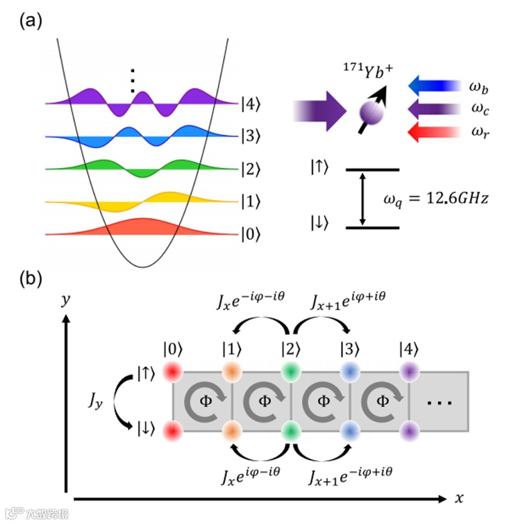 目前研究者已经采取了各种方案来创建合成维度,例如冷中性原子的内部能级或离散动量态,以及光子学中的不同频率或轨道角动量。作为量子信息处理和量子模拟的主要平台之一,离子阱通过激光诱导声子边带跃迁和自旋相关力,利用离子的内部能级自然地实现了声子态的高保真初始化、操纵和读取。自旋玻色子耦合系统的量子模拟也已经在单个捕获离子上实现了量子拉比模型,并在多达数十个离子上实现了类哈伯德模型。此外,自旋和声子态的联合断层扫描也得到了证实。以上这些工具使得测量合成点阵上的群体和流动成为了可能。