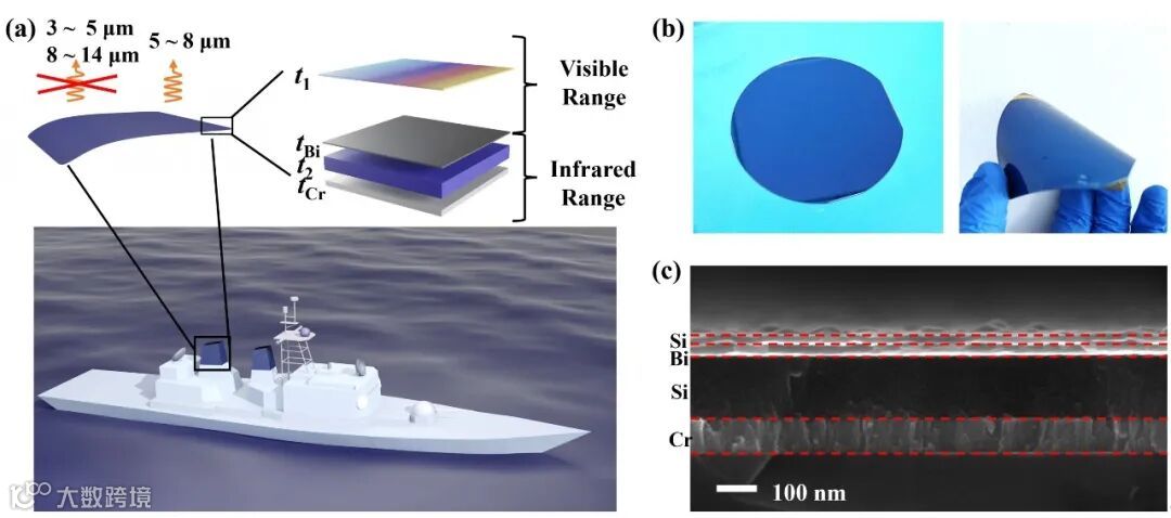 图1 可见-红外兼容伪装深亚波长超构薄膜概念示意图与样品图片