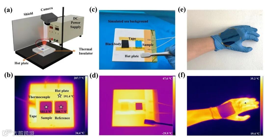 为了验证所制备的可见-红外兼容伪装超构薄膜的伪装性能,团队又进一步模拟了几个实际的应用场景。场景一实验结果显示,与参考样品(大气窗口与超构薄膜具有相同的辐射性质,而非大气窗口辐射性能要低得多)相比,我们所提出的超构薄膜具有明显更好的降温效果(图3(a, b))。场景二中我们以“海洋”为背景,图3(c,d)中的结果显示蓝色的超构薄膜样品不但与“海水”的颜色几乎完全一致,而且在热红外相机所拍摄的照片中其基本也可与“海水”背景完全融合。最后,超构薄膜的总厚度仅为几百纳米,具有良好柔性性能,可适用于曲面物体伪装需求(见图3(e,f))。