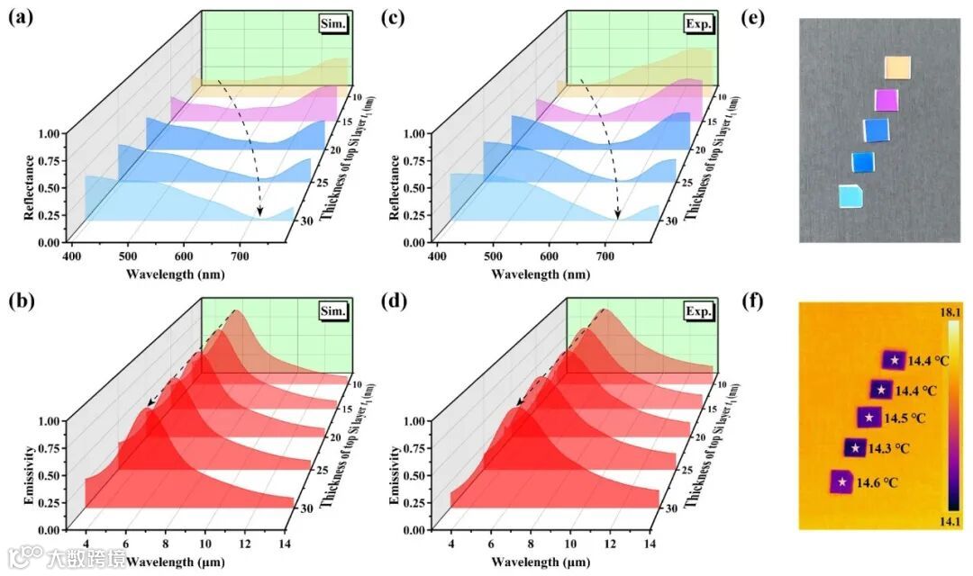在合适的设定底部三层厚度并保持不变的情况下,改变顶层Si的厚度,超构薄膜可见光谱的特征会随之变化,而红外辐射谱的性质则保持不变(结果如图2所示)。也就是说,我们可以通过改变顶层Si的厚度,使超构薄膜呈现不同的颜色,以适应不同背景,同时保证在红外大气透明窗口低辐射以抑制其红外热辐射,和红外大气非透明窗口高辐射以实现辐射降温的性质不变。这样可见-红外即可解耦调控,实现可见-红外兼容伪装的要求。