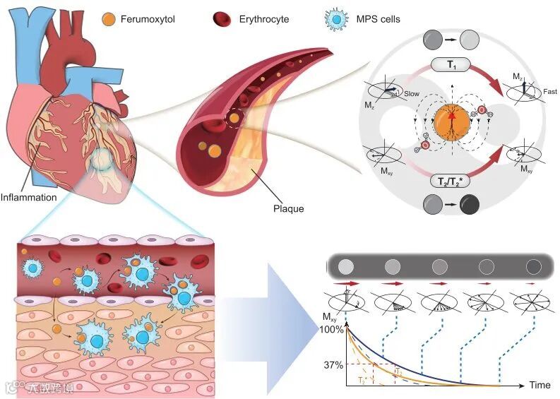 图1. FE-MRI原理示意图。在血池期,ferumoxytol显著缩短血液的T1和T2弛豫时间,从而在T1加权成像中实现亮血效果,在T2/T2*加权成像中实现黑血效果。在延迟期, ferumoxytol的局部聚集破坏局部磁场的均匀性,加速横向磁化向量Mxy的衰减,从而产生负对比度。