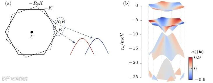 图2 转角双层过渡金属硫化物体系的超晶格mini能带层赝自旋结构示意图 (a) 两层之间的相对转动导致来自不同层的带边在动量空间中的相对移动 (红色和蓝色曲线分别代表上层和下层的带边色散),同时也破坏了所有镜面对称性,导致手征结构;(b) 层间量子隧穿将两层的带边杂化耦合成的mini能带,图中展示的是2°转角下的能带,颜色标注σz(层赝自旋的z分量)在超晶格Bloch态下的期待值,展示了层赝自旋在动量空间的纹理,由转角调控