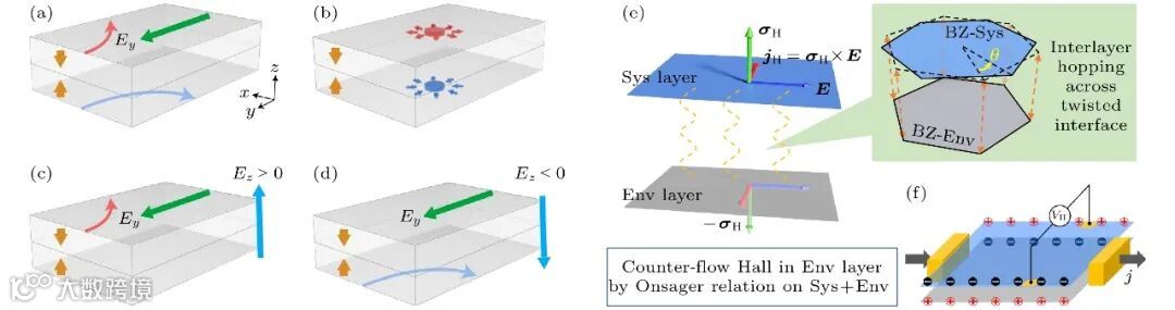 图1 双层范德瓦耳斯体系中时间反演奇和时间反演偶的线性层霍尔效应 (a)—(d) 双层反铁磁绝缘体中时间反演奇的层霍尔效应,黄色箭头代表反铁磁自旋构型。(a) 在面内电场 (绿色箭头) 驱动下两层各自有霍尔电流 (红色和蓝色箭头),大小相等,方向相反。这是因为 (b) 两层相反的动量空间贝里曲率 (红色和蓝色箭头)。(c),(d) 施加门电场 (蓝绿色箭头) 会使霍尔电流只出现在一层之中,门电场反向则霍尔电流电流层分布相反。(e),(f) 双层非磁性体系中时间反演偶的层霍尔效应。红色,绿色,蓝色箭头分别代表矢量关系 jH = σH×E 中的3个矢量。(e) 非孤立二维系统层 (sys layer,蓝色平面) 和环境层 (env layer,灰色平面) 之间的转角界面耦合会在二维非磁性系统层中通过时间反演偶的霍尔效应产生霍尔电流。而整个双层系统满足的昂萨格关系要求环境层中必然产生相反的霍尔电流。绿色阴影区域表示两层相对转角为θ时布里渊区之间的层间跃迁。(f) 样品边界上电荷积累 (红色和黑色,+/–) 导致的时间反演偶的霍尔效应的霍尔电压能够被层分辨的测量所探测,黑色箭头代表外加驱动电流,转载自文献 [12,19]