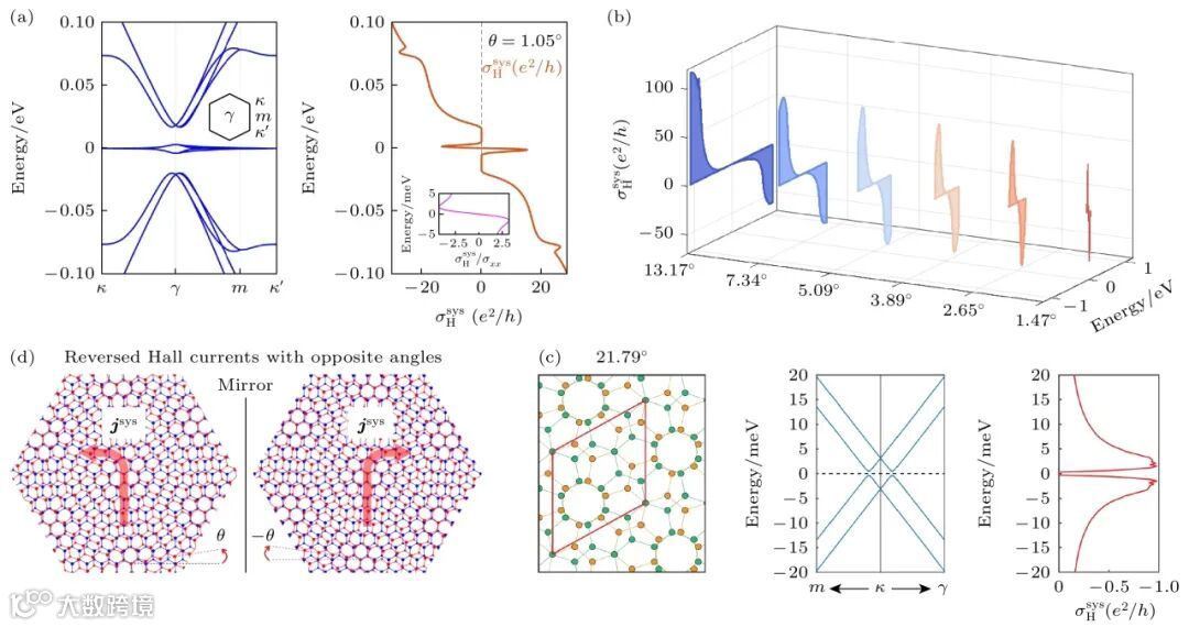 图3 转角双层石墨烯在不同角度下的能带结构和时间反演偶的霍尔电导率 (a) θ=1.05°,插图描述的是化学势位于中心能带时霍尔电导率 σsysH 与纵向电导率 σxx 的比值,即霍尔比率。(b) 霍尔电导率 σsysH 的两个中心峰值随两层石墨烯相对转角的演化。考虑自旋简并度,这里霍尔电导率 σsysH 要乘以2。(c) 转角 θ=21.79° 时的转角双层石墨烯结构 (红色平行四边形围成的区域是一个莫尔原胞),狄拉克点附近的低能能带结构,和系统层中的霍尔电导率。(d) 系统层中的霍尔流 j sys 会随着两层相对转角变号而反向。这是因为转角反号后的莫尔体系是反号前体系的镜像对称。在计算中取电子的弛豫时间为 1 ps。转载自文献 [19]。