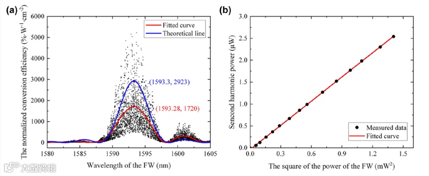 使用可调谐连续波激光器作为基波光源,对所制备器件的倍频性能进行了表征,在1593nm中心波长处,测得归一化倍频效率1720%W-1cm-2,为理论值的60%。