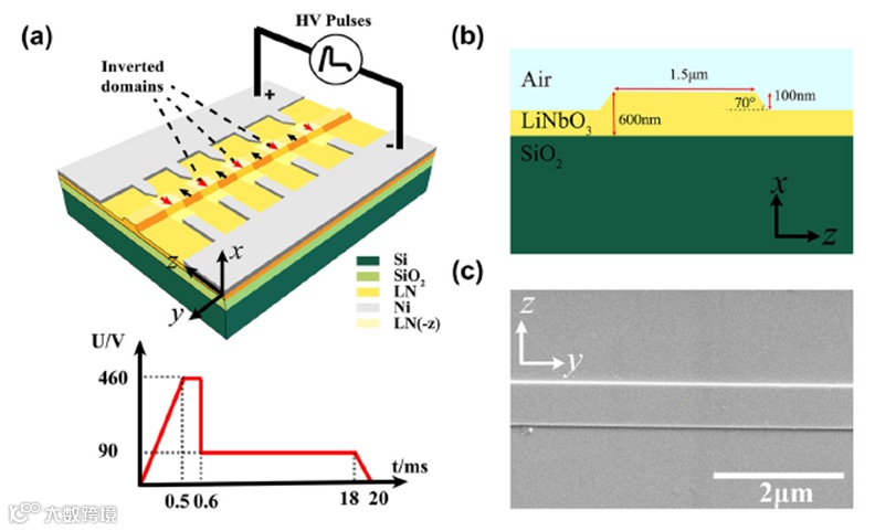 图1 (a)极化装置示意图,(b)脊型波导界面示意图,(c)极化后的波导电镜表征图。
