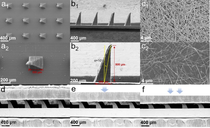 图2. (a1,a2)PVA/H3PO4介电层的俯视SEM图像,(b1,b2)PVA/H3PO4介电层截面SEM图像,(c1)AgNWs的SEM图像,(c2)AgNWs/TPU/IL电极的SEM图像,(d-f)麦芒状PVA/H3PO4介电层加载前后形貌演变的SEM图。