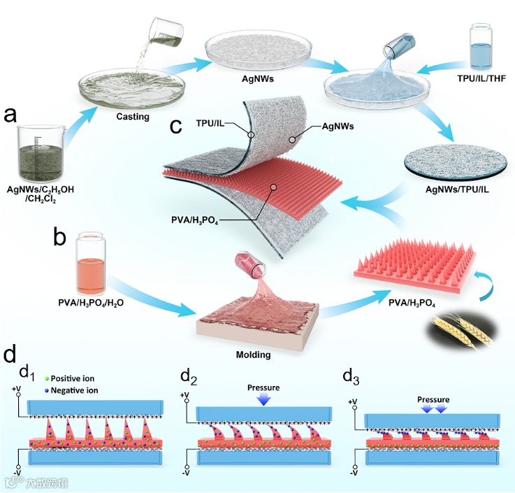 图1. (a)透明电极的制备,(b)具有麦芒仿生结构介电层的制备,(c)所制备传感器的结构示意图,(d)压力传感器响应机制示意图。