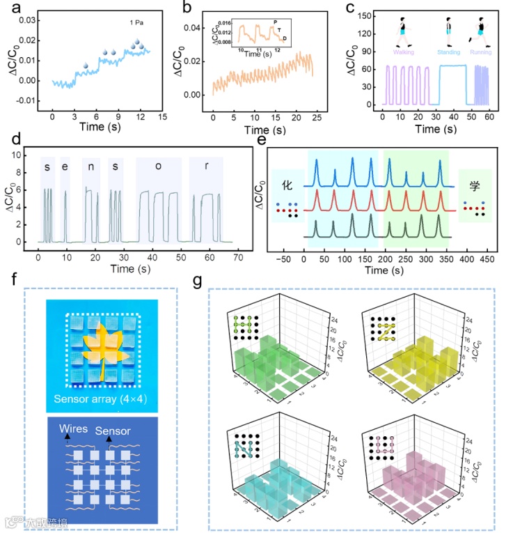 图5.(a)传感器对水滴产生的微弱压力刺激产生的电容响应信号,(b)传感器检测到的脉冲信号,它清晰地显示了脉冲信号的三个特征波,(c)传感器检测的人体运动的电容响应,(d)“sensor”信息的加密和翻译,(e)对“化学”盲文信息的识别,(f)传感器阵列的光学照片和图片,(g)“H”、“Z”、“N”、“U”压力图的识别。