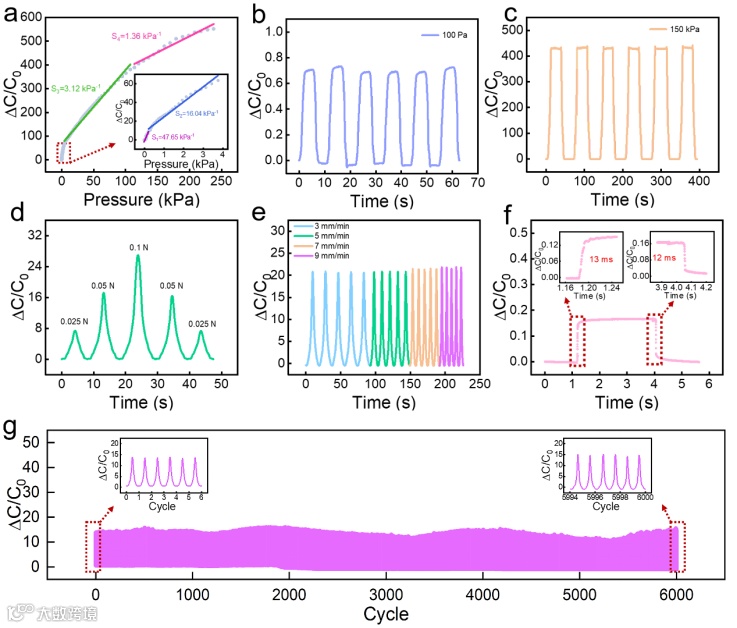 图4.(a)基于麦芒仿生结构介电层的传感器在0 ~ 238.65 kPa压力范围内的ΔC/C0演变曲线,(b)在100 Pa循环加载下的ΔC/C0演变曲线,(c)在100 Pa循环加载下的ΔC/C0演变曲线,(d)在不同力(0.025 N、0.05 N 和 0.1 N)加载下的ΔC/C0演变曲线,(e)在不同加载速率(3、5、7、9 mm/min)下对0.1 N加载下的ΔC/C0演变曲线,(f)离-电式压力传感器的响应/恢复时间,(g)在加载压力为0.05 N、加载速度为5 mm/min条件下的6000次循环试验中传感器的ΔC/C0演变曲线。