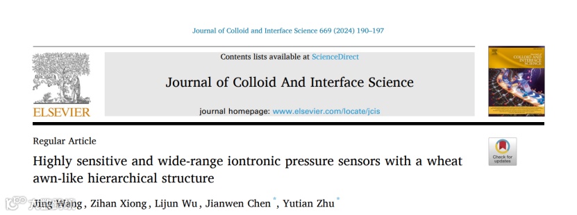 相关研究成果以“Highly sensitive and wide-range iontronic pressure sensors with a wheat awn-like hierarchical structure”为题发表在期刊《Journal of Colloid and Interface Science》上。杭州师范大学材料与化学化工学院研究生王静为第一作者,杭州师范大学材料与化学化工学院朱雨田教授、陈建闻副教授为共同通讯作者。
