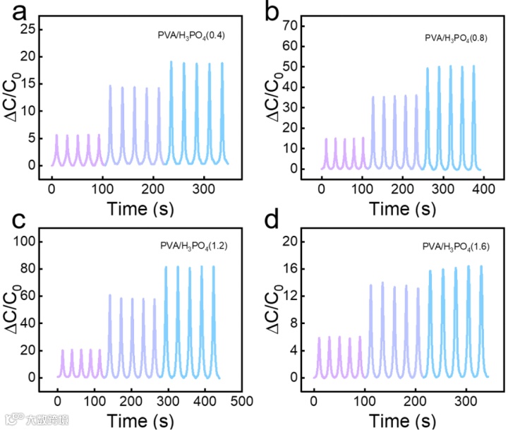 图3. 基于PVA/H3PO4(0.4)(a)、PVA/H3PO4(0.8)(b)、PVA/H3PO4(1.2)(c)和PVA/H3PO4(1.6)(d)的传感器在0.1 N、0.5 N和1.0 N负载下的相对电容变化。