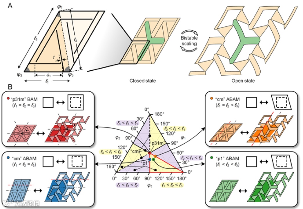 在剪纸超构材料中,通过在薄片上穿孔形成独特的图案,可以实现拉胀性、变形、多稳态展开和其他力学响应。与折纸和双层薄膜等其他变形超构材料相比,剪纸可以通过打开切口,轻松实现相当复杂的面内和面外变形,因此在航空航天可展开结构、太阳能电池、生物医学器件和机器人等多个领域都很有吸引力。平面剪纸图案所具有的各种特性和功能主要源于其重复形状的棋盘格,每个结构都嵌入了其组成缝隙的内在对称性,如旋转对称性、镜像对称性和平移镜像对称性。其中,三重和四重旋转对称图案引起了人们的关注,因为它们能够提供双稳态拉胀展开,并重新配置以保持变形状态。在剪纸领域,几何失措表现为不相容的几何限制引起的局部无序展开。软超构材料中的几何失措概念及其与切口对称性之间的相互作用仍然难以捉摸,需要进一步研究,因为它有望开启迄今为止超构材料无法实现的变形和特性。
