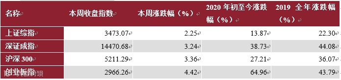 本周上证综指收涨2.25%报3473点,深证成指收涨3.24%报14470点,沪深300收涨3.36%报5211点,创业板指收涨4.42%报2966点。