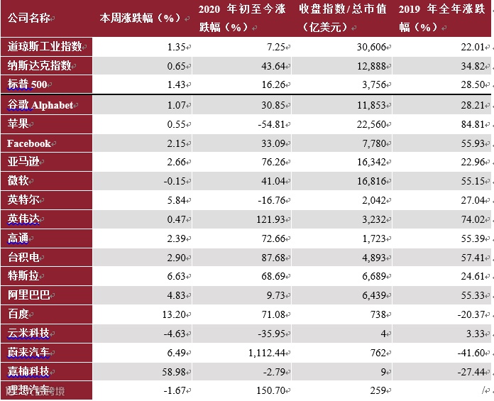 同时,我们分别追踪跨市场指数和个股行情动态,对于上市公司,暂时选择了最具代表性的16只美股及8只港股。