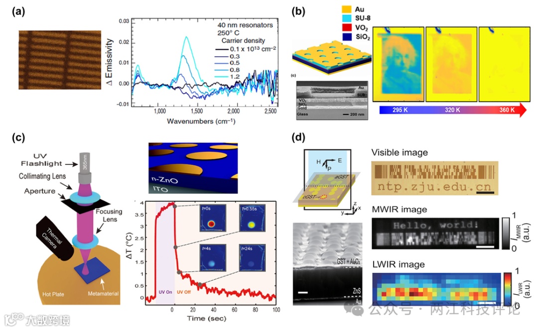 图5 热辐射的动态调控:将石墨烯或相变材料VO2、GST等与超表面设计相结合,可实现对热辐射光谱的灵活调控。另外结合激光等外部调控手段可实现空间与时间上可控的热辐射效果。