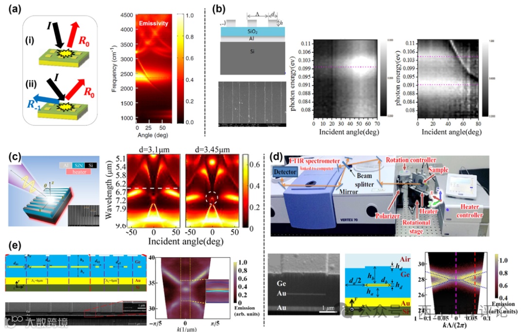 图2热辐射角度调控:通过多种超表面耦合机制,如临界耦合、Fano共振等可调控热辐射的角度响应,实现定向辐射。实验上通过角分辨热辐射测量(ARTES)可对结构色散及辐射特性进行表征。