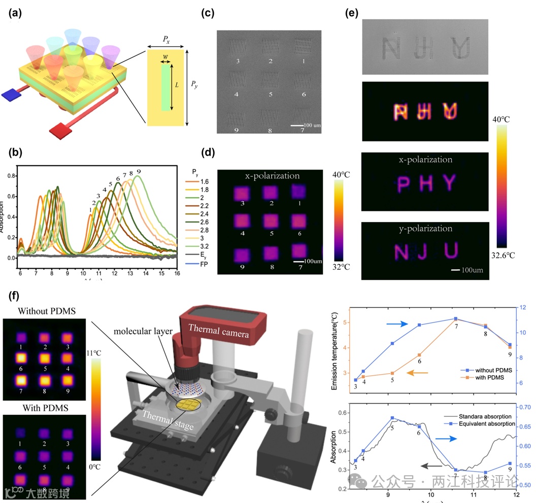 图10 基于超构微腔阵列的集成热辐射芯片及其红外吸收光谱探测应用:待测有机分子的吸收光谱信息可以展现在空间上分布的超微腔阵列中。