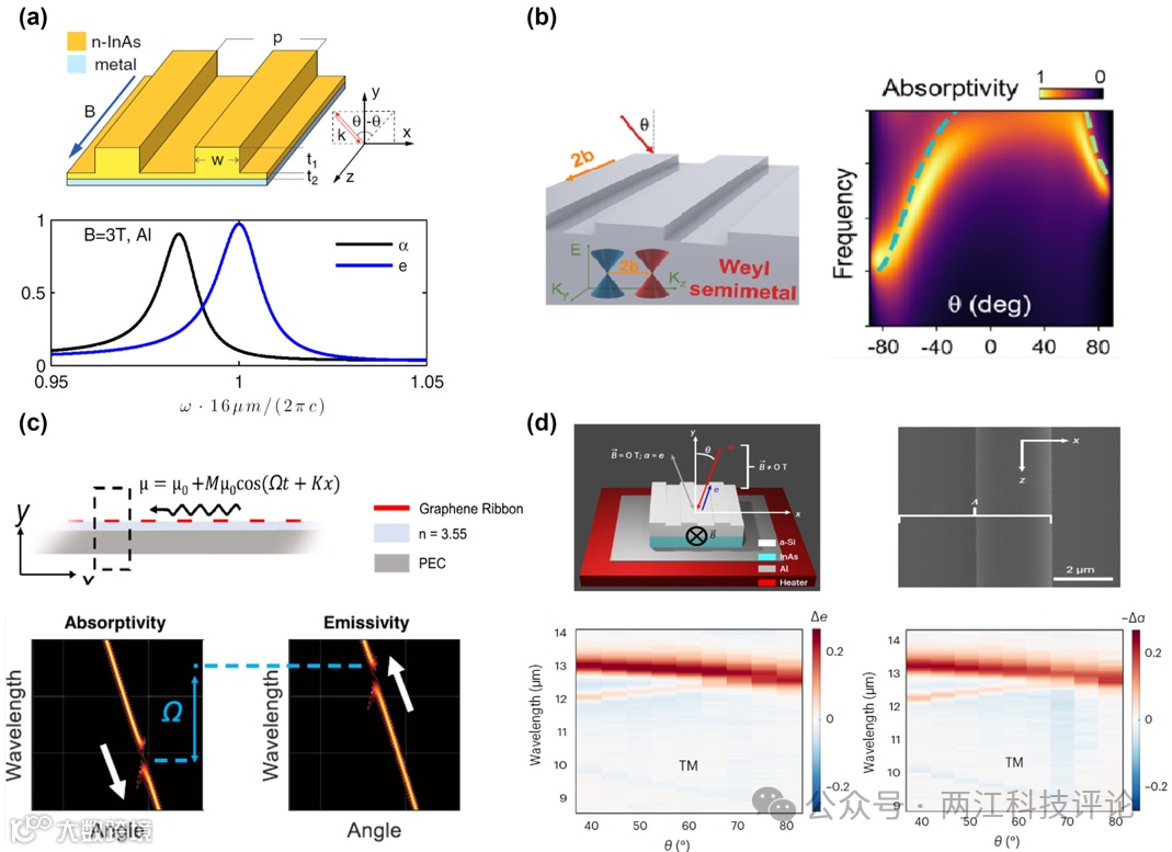 图6 非互易热辐射:将磁光材料与超表面结构相结合,通过磁场调控可产生非互易热辐射。另外通过磁性韦尔半金属结构或对超表面的时空调制方法也可实现非互易热辐射。