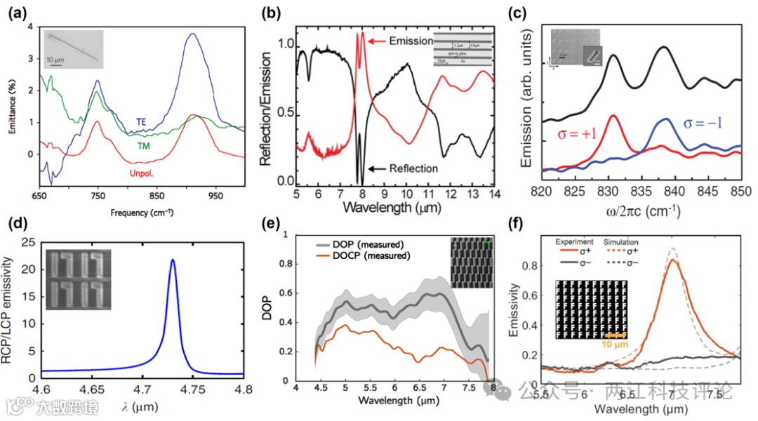 图3热辐射的偏振调控:通过纳米天线或光栅可产生线偏振热辐射;通过手形结构或非手性旋转阵列可产生圆偏振热辐射。