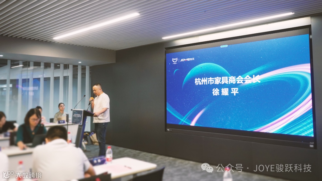 接下来,杭州市家具商会理事单位杭州骏跃科技有限公司总经理胡孙跃致辞,对商会及各位理事的信任与支持表示衷心感谢,并承诺将继续为商会的发展贡献自己的力量。
