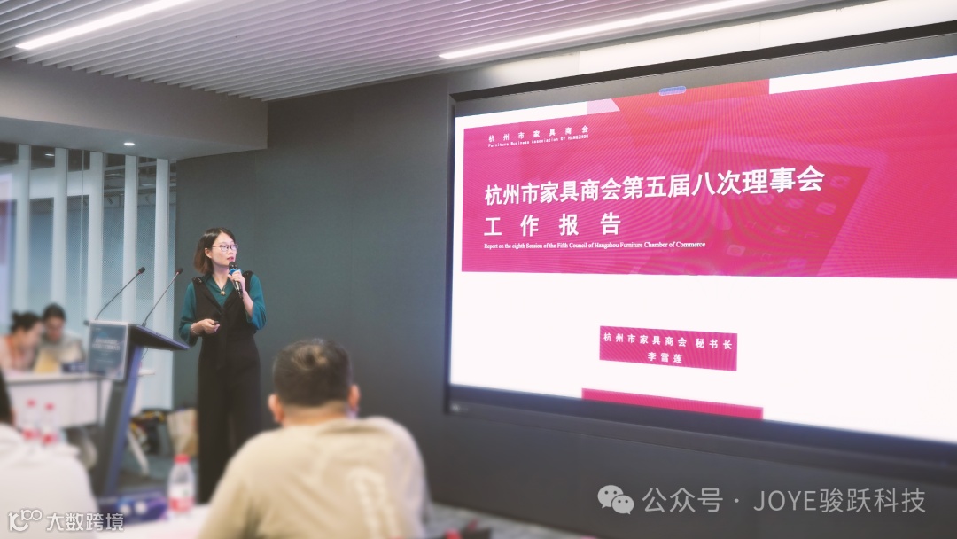 会议第二项议程,由杭州市家具商会秘书长李雪莲汇报2024年上半年度工作完成情况和下半年工作计划。