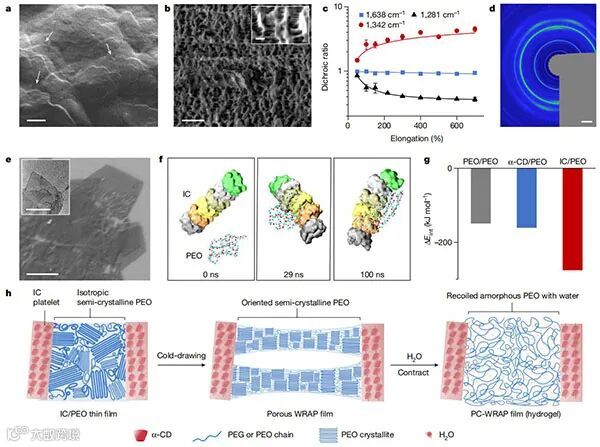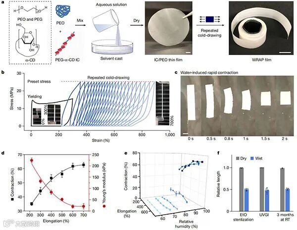 干燥、柔性和独立的水响应形状适应聚合物(WRAP)薄膜,它们在环境条件下稳定,在湿润时迅速收缩,然后转化为柔软和可拉伸的水凝胶薄膜,与软组织和平面电子制造工艺兼容;通过定向水溶性半结晶聚环氧乙烷(PEO)结构域与聚乙二醇(PEG)-α-环糊精(α-CD)复合交联来构建WRAP薄膜。
