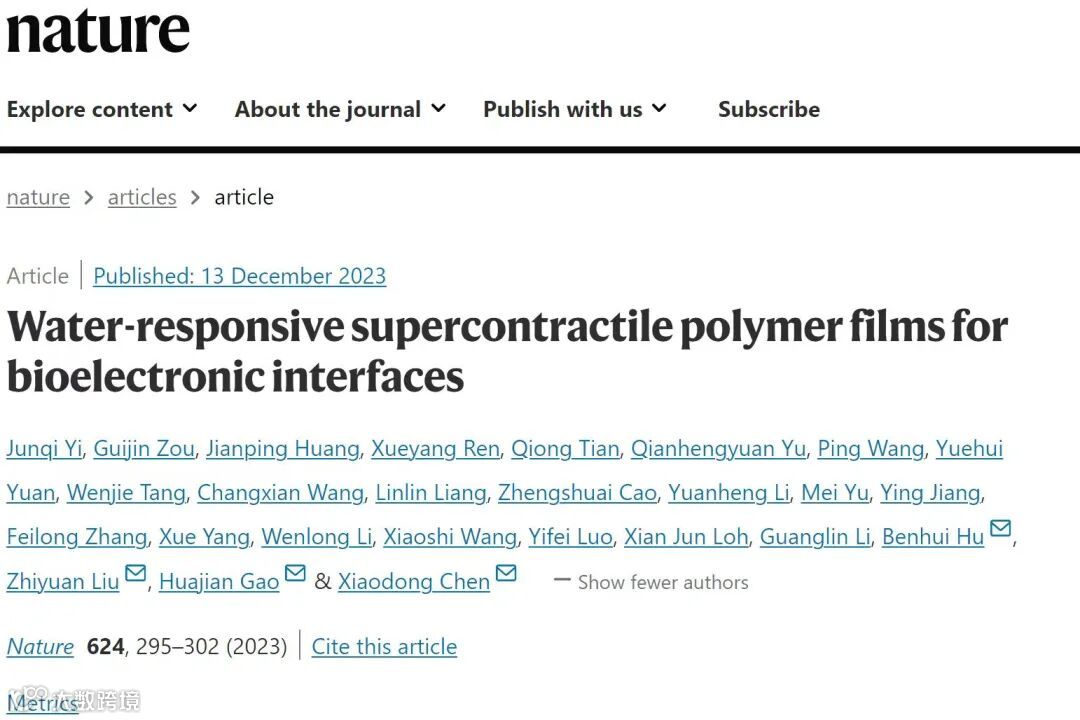 2023年12月13日,相关研究成果以“Water-responsive supercontractile polymer films for bioelectronic interfaces”为题发表在Nature上。