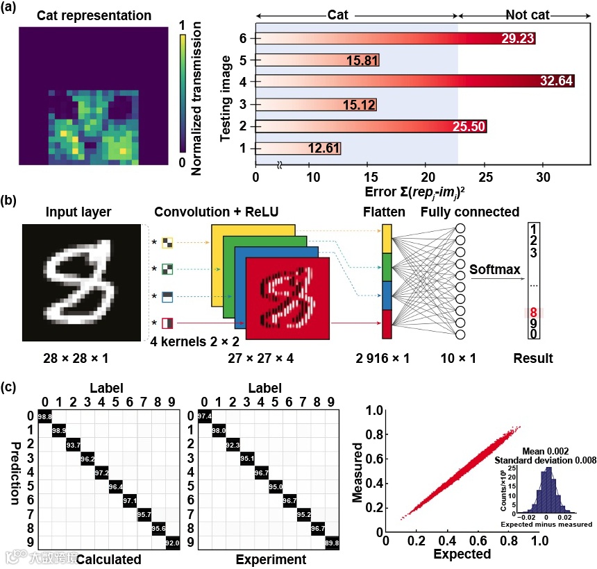 图14 神经形态处理器执行的人工智能任务。( a )训练协同学习网络,获得猫的图像模型和图像的分类结果。( b ) 基于卷积神经网络的手写数字图像分类。( c )乘累加计算的准确性。