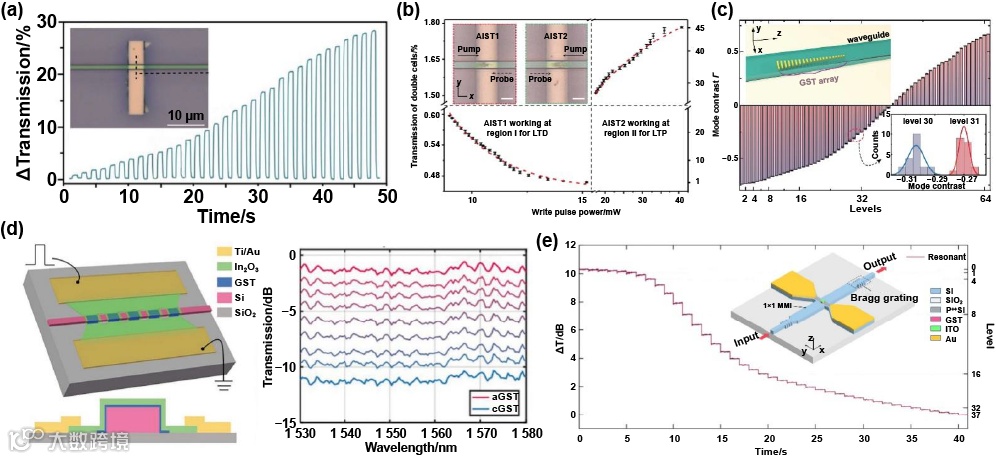 图10 相变波导存储器的多值存储特性。( a )5比特相变波导存储器。( b )实现45个存储位的双相神经突触。( c )实现6比特存储容量的GST超表面波导器件 ( d )实现6比特以上存储容量的分段式In2O3 / GST微加热器器件。( e )实现38个存储位的法布里-珀罗腔结构相变存储器。