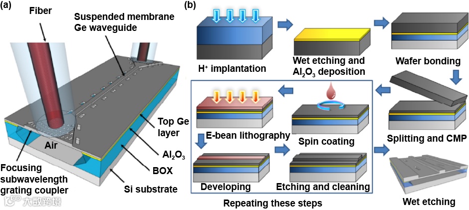 图4 悬浮锗波导平台。( a ) 用于光纤-芯片光耦合的悬浮锗波导与用于光信号输入输出的聚焦型亚波长光栅耦合器的器件原理图。( b ) 悬浮锗波导平台的制备过程。