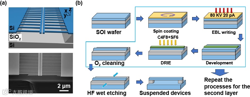 图3 悬浮硅波导平台。( a )全悬浮狭缝波导结构示意图和SEM照片。( b ) 悬浮波导平台的制造流程。
