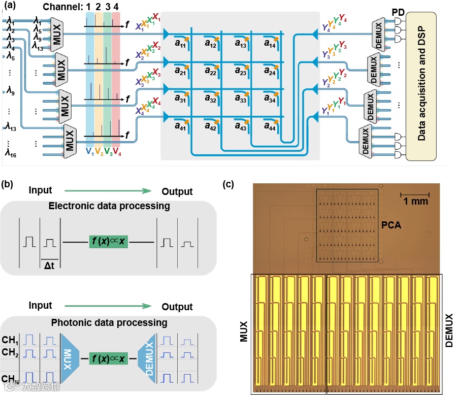 图13 基于氮化硅波导的存内光计算张量处理器内核。( a )基于波分复用( WDM )架构的光波导交叉阵列实现并行计算。( b )电子计算单元中进行的串行数据处理,和光子计算单元中利用WDM方案进行的并行数据处理。( c )基于布拉格波导光栅的波长复用器和解复用器的交叉波导阵列光镜图。