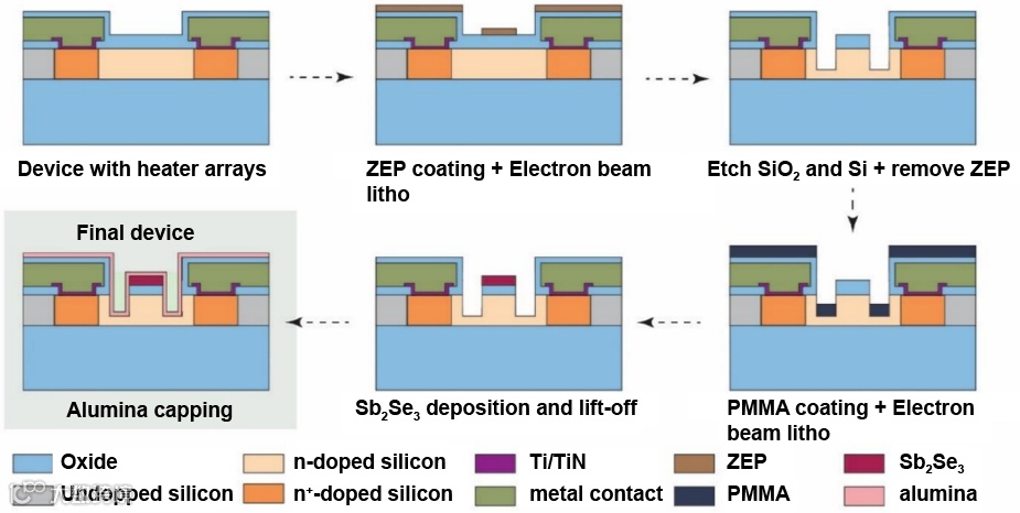 图7 离子注入式硅波导微加热器。离子注入式波导微加热器顶部Sb2Se3薄膜的后道集成工艺。