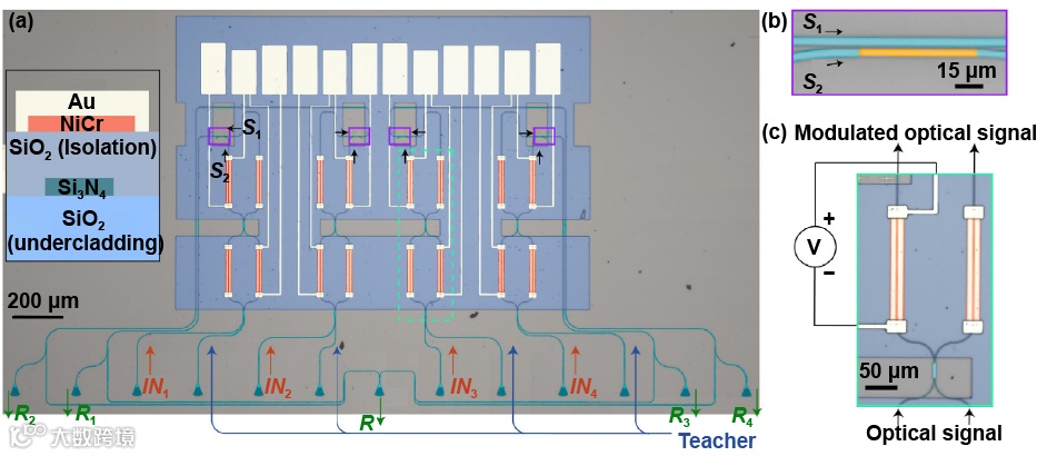 图11 用于协同学习的相变波导神经网络。( a )光网络的光镜图。( b )协同学习器件单元。( c )可重构马赫-曾德尔干涉仪。