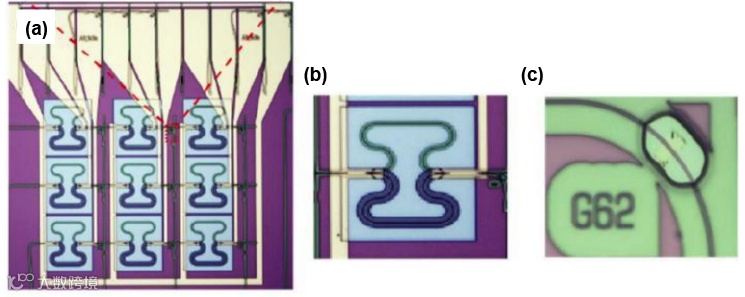 图12 基于相变材料-硅光波导的3×3小型光子张量处理器内核。( a )小型张量处理器的光镜图。( b )可重构马赫-曾德尔干涉仪。( c )相变波导存储器单元。
