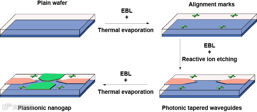 图9 用于实现光电混合读写操作模式的表面等离子体激元纳米缝波导器件。套刻对准标记、锥形波导和表面等离子体激元纳米缝波导的制作流程。