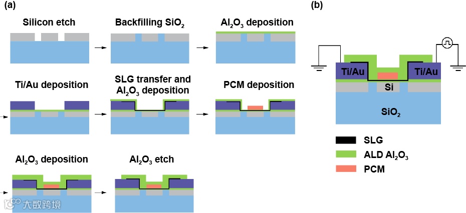 图8 基于石墨烯波导的微加热器器件。( a )石墨烯相变波导器件的制备工艺。( b ) 石墨烯相变波导器件的截面图。