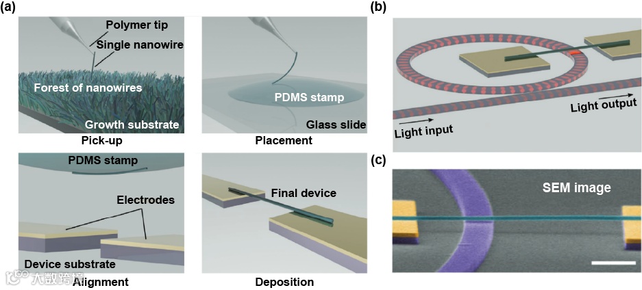 图6 相变材料纳米线波导器件。( a )相变材料纳米线的制备和集成过程,包括拾取、放置、对准和沉积等步骤。( b )集成了相变材料纳米线的圆环谐振器的原理图和( c )SEM图像。