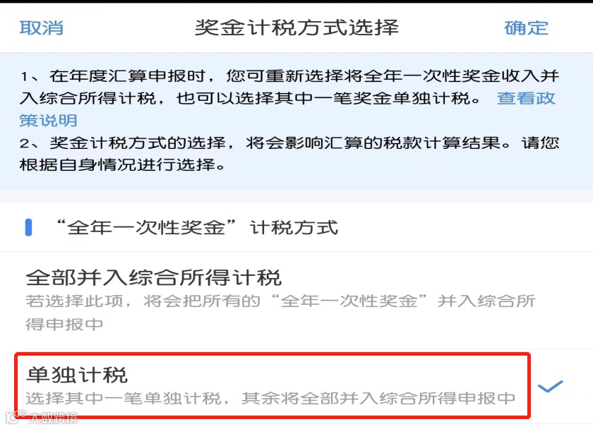 2.“全年一次性奖金”计税方式选择。在办理汇算清缴业务时,对于全年一次性奖金,我校大部分教职工选择“单独计税”较为合适。