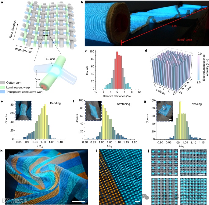当使用工业剑杆织机将导电纬纱和发光经纱与棉纱织成时,每个交错的纬纱和经纱形成一个EL单元(图1)。合成纤维材料,如尼龙和聚酯纤维,也可以与导电纬纱和发光经纱纤维共织,用于各种应用(扩展数据图。1j,k)。使用这种方法,生产了一种 6 米×25 厘米(长×宽)的大面积展示纺织品,其中包含大约 5 × 10 件5EL单位(图1)。600 EL单位的发射强度相对偏差变化了<8%。如此微小的强度差异表明,这些纤维非常适合大规模生产大面积展示纺织品。经过 1,000 次弯曲循环,绝大多数EL单元的强度保持稳定(变化<10%)。此外,即使沿不同方向反复折叠,大多数EL单元的强度也变化了<15%,并且折叠线上EL单元的强度在每个折叠方向的10,000个折叠周期中保持稳定,表明其耐用性优于传统薄膜显示器。还获得了五颜六色的纺织品(图1)。具有均匀间隔的EL单元将铜和锰等不同元素掺杂到 ZnS 荧光粉中。由于纤维是编织的,因此可以通过调整编织参数来改变纬经接触点之间的距离,从而轻松调整EL单元的密度(图1)。在这里实现的最窄间距约为 800 μm。